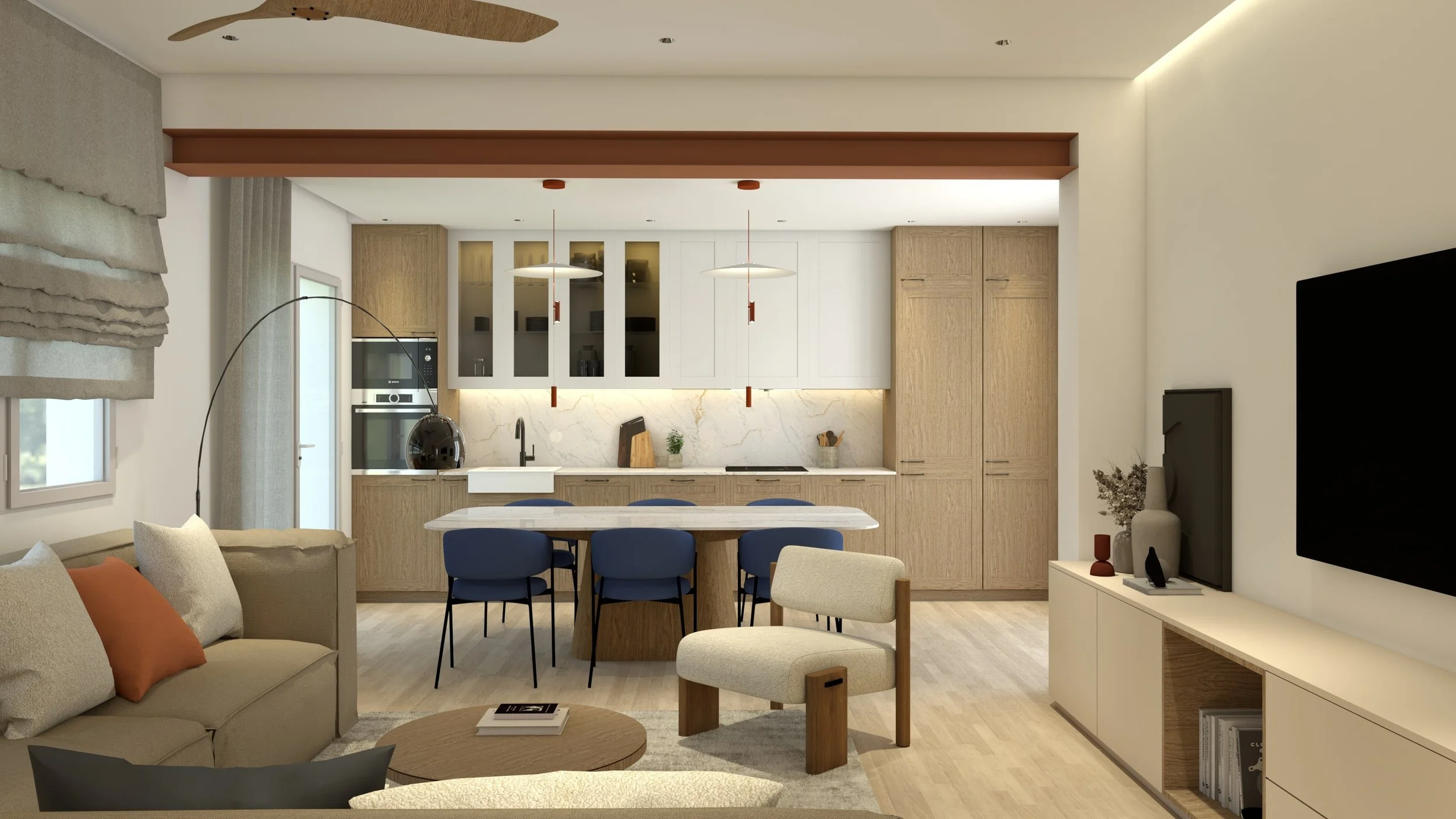 Por último en la zona de la cocina pintamos la viga para importancia y continuidad al espacio y le mostramos los diferentes acabados que podría llevar en los muebles de cocina.